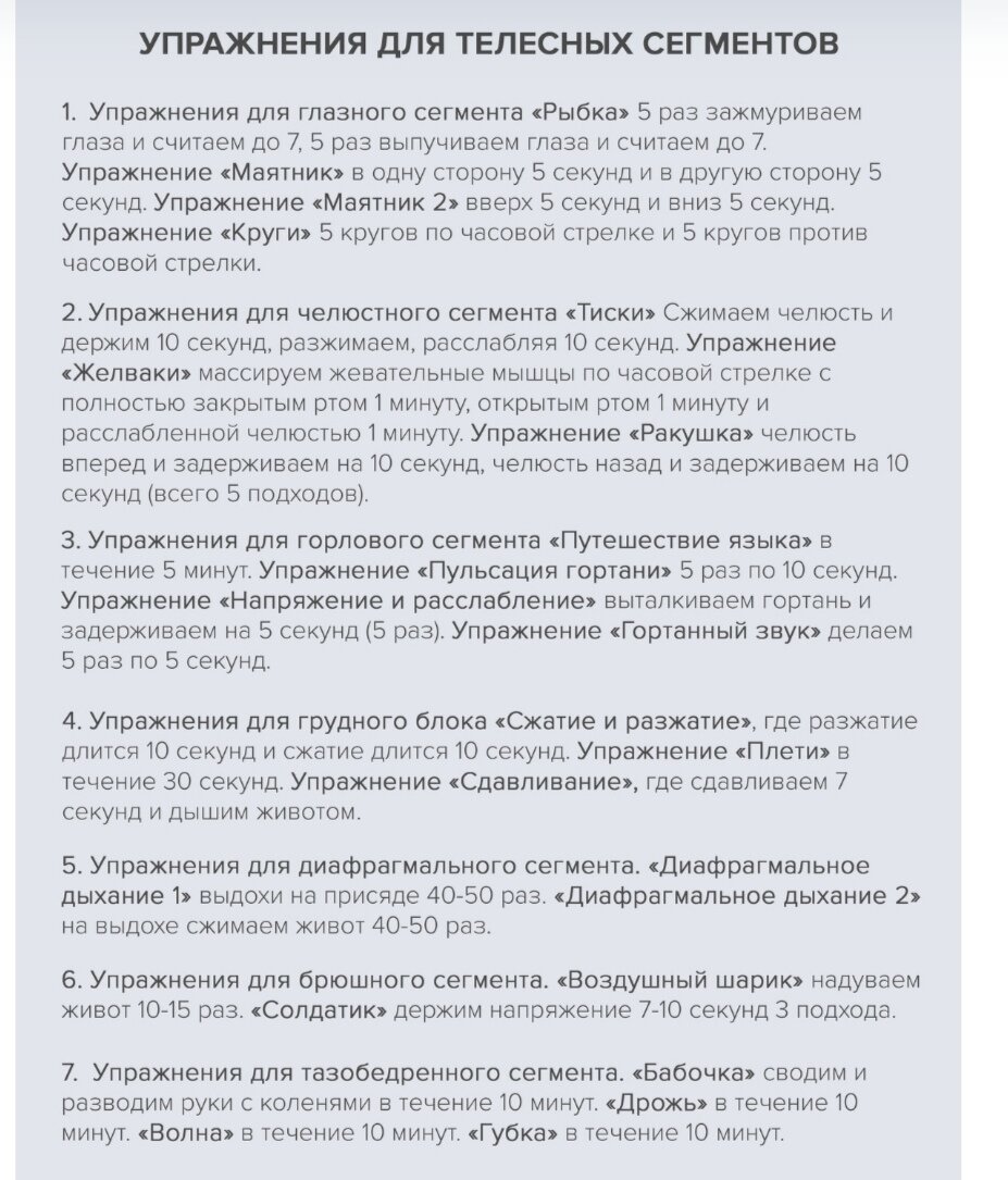 Практики разрушения телесных блоков Основные правила: 1. Важно выполнять работу с блоками сверху вниз, начиная с глазного сегмента и заканчивая тазо-бедренным. 2. Перед выполнением упражнений обратите внимание на свои ноги. Они должны стоять на полу. Почувствуйте, как Вы твердо стоите на ногах. Уделите фиксации своего внимания больше времени, так как для упражнений необходимо быть в контакте со своими опорами. 3. Дыхание. Этот процесс является неотъемлемой частью жизни. Благодаря свободному дыханию мы можем чувствовать себя хорошо и спокойно. Регулировать свое эмоциональное состояние. Если мы будем этот процесс обесценивать и дышать, как попало (задержка дыхания или поверхностное частое дыхание), то можем только усилить напряжение в мышцах и теле. 4. Атмосфера. Для качественной проработки своих блоков создайте удобное и безопасное пространство. Вас никто не должен отвлекать. Попросите соих близких и знакомых, чтобы они не отвлекали Вас в течение 40 минут выполнения практики. Необходим