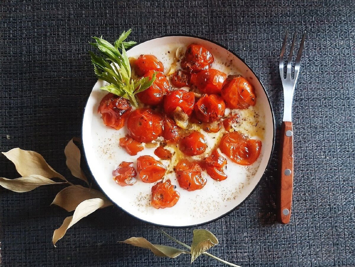 Любителям печеных овощей посвящается)Невероятно вкусные помидорки в йогурте со специями.Быстро,вкусно,красиво. -Черри-250 гр -чеснок 1-2 зубчика -цедра лимона кусочками и натертая (примерно 1 ч.л.) -сахар,соль,перец,по вкусу -прованские травы -оливковое масло -греческий йогурт-250 гр. В форму складываем черри,чеснок нарезанный кружочками,сбрызгиваем маслом,солим,перчим,посыпаем сахаром,травами,кладем кусочки цедры между помидорками.Ставим в разогретую до 200 гр духовку на 15 мин,помидоры должны начать булькать,потом переставляем на режим гриль и подсушиваем 5-10 мин. В йогурт добавляем тертую цедру,перемешиваем,переливаем в миску и добавляем сверху готовые помидоры вместе с соком.Подаем с поджаренным хлебом.