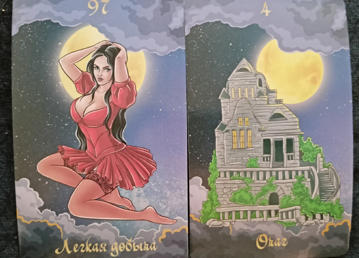 Лёгкая добыча. Провокация, эпатаж, ощущение своей сексуальной энергии. Исключительно демонстрация своей доступности, не более. Цинизм, спокойствие, деловой подход. Осознание своей ценности, равнодушие внутри. Очаг. Семья,тепло, стабильность. Символ покоя, уверенности в своих силах. Здоровье - общепринятые методы лечения. Спокойный и душевный человек, покровитель. Расклад цыганских карт предлагает направление движения в жизненных ситуациях,хотя не указывает точной даты исполнения событий во временном пространстве. НЕОЖИДАННАЯ РАДОСТЬ – одна из самых положительных. Даже если она выпадает в очень негативном раскладе, то она смягчит влияние других карт. Сама по себе означает неожиданное, но очень приятное известие. Обычно это какие-то материальные блага, но могут быть и иные варианты. Карта НЕОЖИДАННАЯ РАДОСТЬ сообщает о том, что если есть возможность рискнуть – стоит рисковать. Это обязательно окупится. Возможен выигрыш в лотерею, кто-то вернет старый долг, подвернется вариант заработать