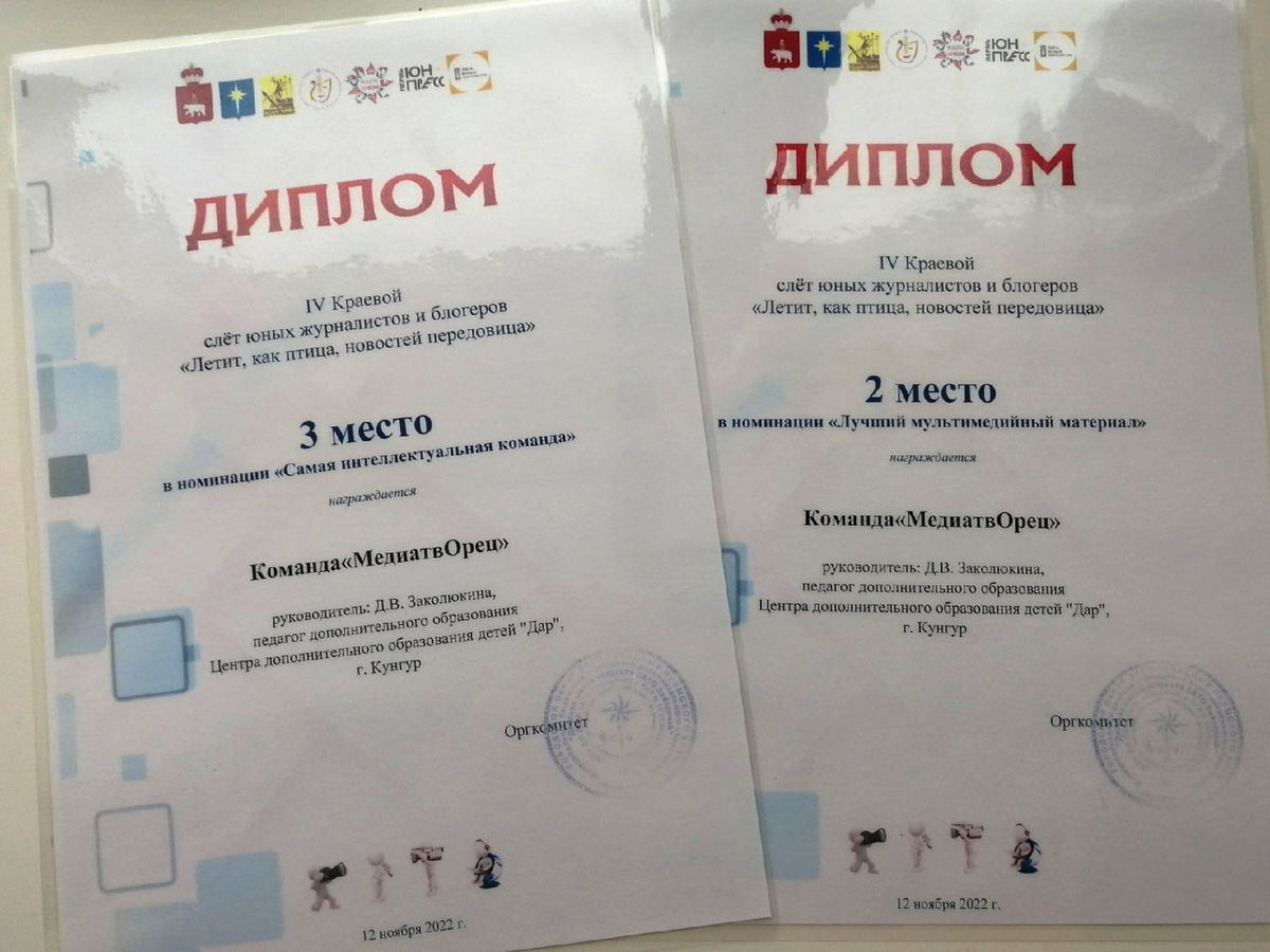 Юные журналисты «Искры», воспитанники творческого объединения «Медиатворец» Центра дополнительного образования детей «Дар» стали призёрами IV краевого слёта «Летит, как птица, новостей передовица». Он прошёл 12 ноября в ЗАТО Звёздный и объединил 20 школьных и студенческих команд ребят Пермского края, увлекающихся журналистикой. Состязания проходили в двух номинациях: «Мультимедиа» и «Видеоролик». Ребята не знали, какое задание их ждёт, равно как и тему своего новостного продукта до приезда на слёт. За три часа команды должны были организовать работу своих редакций и предоставить экспертам материалы на оценку. Кроме конкурса ребята посетили три мастер-класса, на которых узнали, как снять качественный ролик, написать статью, а также познакомились с работой всероссийских и международных детских центров. Юные журналисты приняли участие и в интеллектуальной игре ,«Мой Пермский край», в которой определились свои лидеры. Мероприятие прошло при поддержке общероссийской организации «Лига юных