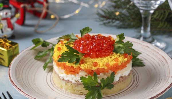 Предлагаю вам вкусный праздничный салат с тунцом и красной икрой, который делается слоями. Тунца можно использовать как в собственном соку, так и в масле. Если вам достался тунец в масле, как в моём варианте, то масло следует слить, а если в собственном соку, то скорее всего, рыба там будет крупным кусочком, который следует измельчить. Приготовление не отнимает много времени, если заранее сварить овощи и яйца.