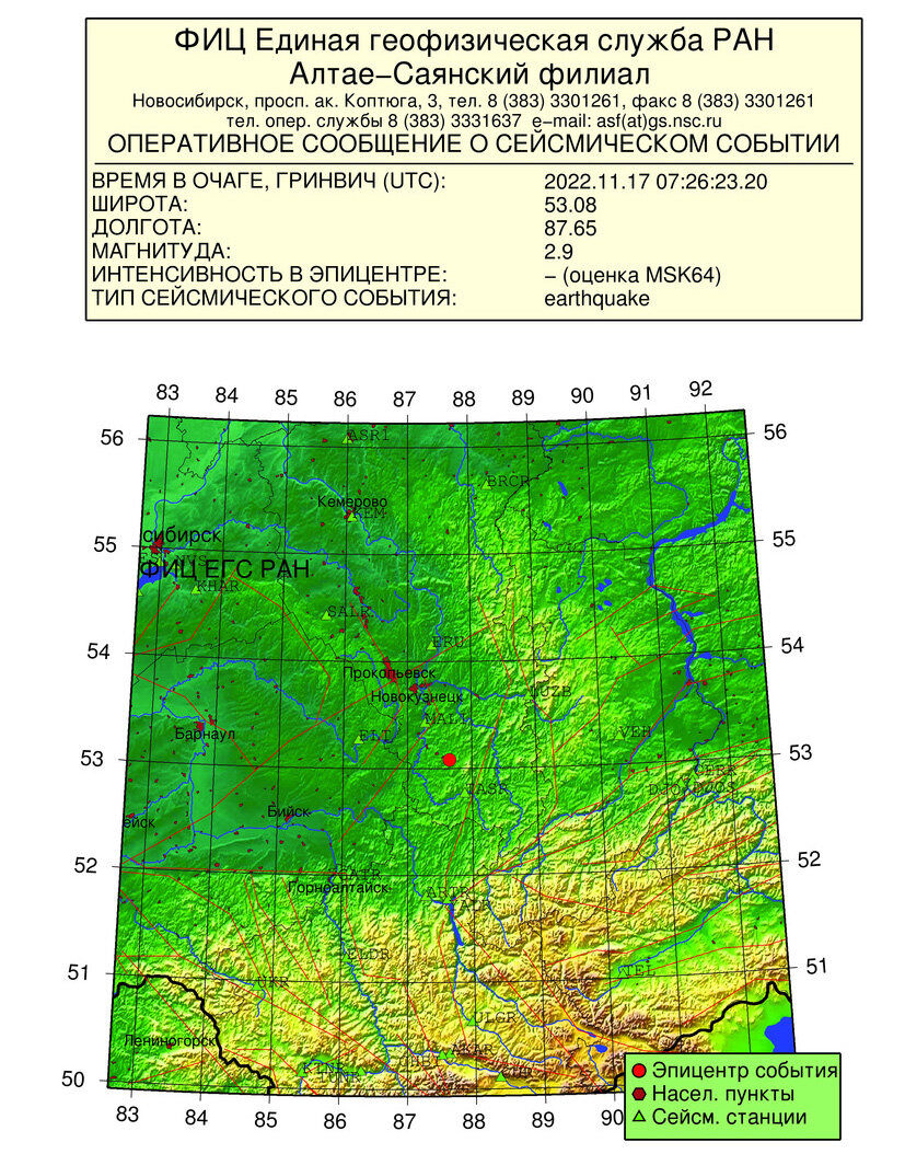 На юге Кузбасса днём 17 ноября сейсмостанции зафиксировали новое землетрясение. Информация появилась в оперативной сводке Алтае-Саянского филиала Единой геофизической службы РАН. Согласно оперативным данным, землетрясение магнитудой 2,9 произошло в 14:26 по местному времени. Эпицентр находился на территории Таштагольского района, в точке с координатами 53.08 широты и 87.65 долготы. Тип сейсмособытия обозначен как earthquake, или «землетрясение». Как писал A42.RU, самые ощутимые толчки с начала ноября были зафиксированы также на юге области, в Междуреченске — там утром 2 ноября произошло землетрясение магнитудой 4,0. Фото: asgsr.ru
