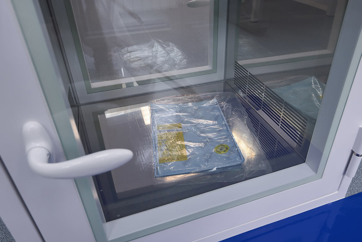 — Передаточное окно (на фото) представляет собой минишлюз, открыть обе двери которого одновременно невозможн⚠️. Сначала открывается первая (в зависимости от направления передачи продукции), затем продукция помещается в окно, закрывается дверь, запирается замок, после чего происходит обдув компонентов воздухом, обеззараженным УФ лампой.