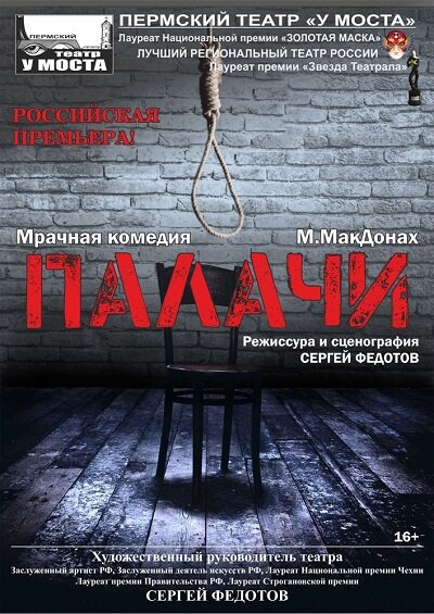 Наверное, каждый из нас хоть раз в жизни задумывался о том, нужна ли смертная казнь в наше время. Я знаю массу аргументов за и против, и в свое время мы с подругой кардинально разошлись во взглядах после фильма "Мертвец идет". Сейчас во многих странах существует мораторий на смертную казнь, но людей продолжает волновать этот вопрос. Относительно недавно, в 2015 году, Мартин Макдонах написал пьесу "Палачи". С.П. Федотов, создатель и руководитель пермского театра "У моста" поставил ее через год, в 2016. Дело в том, что именно Федотов открыл этого ирландского драматурга для нашей публики в начале XXI века и с тех пор знакомит зрителя со всеми новинками Макдонаха и проводит Международные фестивали Мартина Макдонаха. Последний из них кстати, был в этом году. Практически все события в спектакле "Палачи", за исключением пролога первого и второго действий, происходят в одном месте, в пабе. Как вы видите, сцена оформлена совершенно традиционно: барная стойка, столы, стулья. Но приглядитесь,