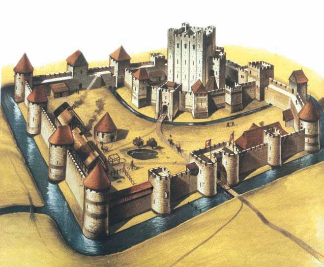 Начиная с VIII века для защиты от нападений норманнов и венгров в Европе было построено немало замков. Постепенно каждый господин старался соорудить себе замок: в зависимости от возможностей — огромный или скромный. Замок — это жилище феодала и его крепость Сначала замки строили из дерева, позднее— из камня. Мощные стены с зубчатыми башнями служили надежной защитой. Замок часто возводили на холме или высокой скале, окружали широким рвом с водой. Иногда его строили на острове посреди реки или озера. Через ров или протоку перекидывали подъемный мост, на ночь и при нападении врага его поднимали на цепях. Из башни над воротами постоянно обозревала окрестности стража и, заметив в отдалении врага, трубила сигнал тревоги. Тогда воины спешили занять свои места на стенах и в башнях. Чтобы проникнуть в замок, надо было преодолеть много препятствий. Враги должны были засыпать ров, по открытому пространству одолеть холм, подойти к стенам, взобраться на них по приставленным штурмовым лестницам ил