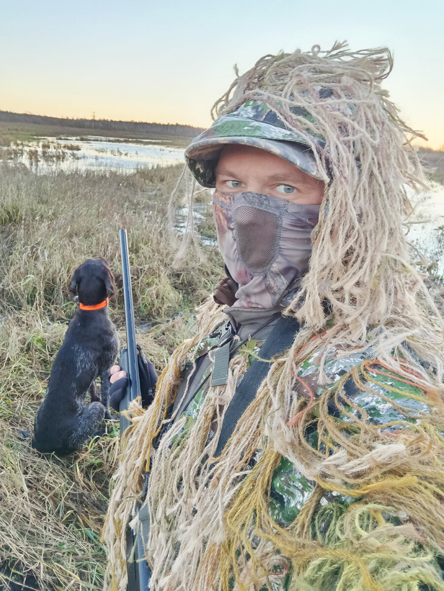 Ветер дует от них на меня, никаких звуков не доносится. Странная ситуация… Вдруг я слышу кря-кря! Кручу головой, но никто не летит. Снова кря-кря… Откуда-то с воды звук. Стою не шевелюсь, Коса сидит рядом и весь дрожит, смотрит на чучела. Выполняет команду «Сидеть», «Ждать». И тут я замечаю крякву, которая выплывает из-за травы прямо за последним чучелом. Накрываю стволом – Бабаббах! Засыпает птицу дробью, но она поднимается и пытается улететь против ветра. Второй раз стреляю и не попал. Птица уходит. Как так-то? До 40 метров выстрел. Не понимаю…