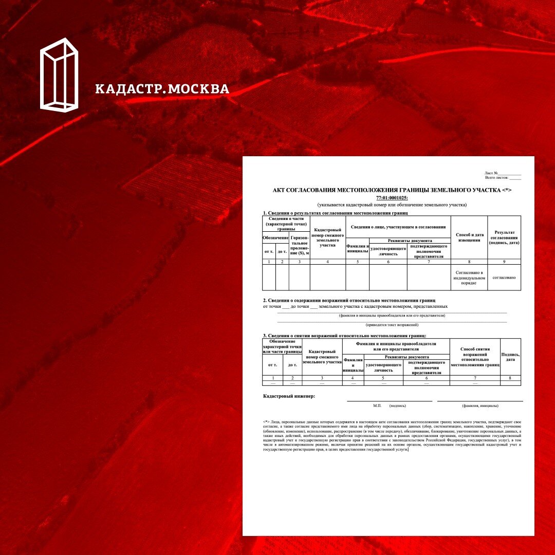 Акт согласования — это документ, в форме которого кадастровый инженер оформляет результат согласования при уточнении границ земельного участка либо при его образовании с одновременным уточнением границы смежного участка [ст.40 221-ФЗ от 24.07.2007] Акт оформляется с личными подписями всех заинтересованных лиц на обороте чертежа либо в электронном виде с заверением усиленными квалифицированными электронными подписями каждого из заинтересованных лиц. Границы могут считаться согласованными и без подписи на акте, но при соблюдении всех следующих условий: Форма акта утверждена Приказом Росреестра №П/0592 от 14.12.2021. В акте указываются реквизиты документов, удостоверяющих личность заинтересованных лиц либо их представителей. Согласно позиции Росреестра, изложенной в письме №13-00451/20 от 08.12.2020, в случае отказа заинтересованного лица в их представлении, такое лицо не вправе участвовать в согласовании и заверять акт своей подписью. Согласно позиции Росреестра, изложенной в письме №18