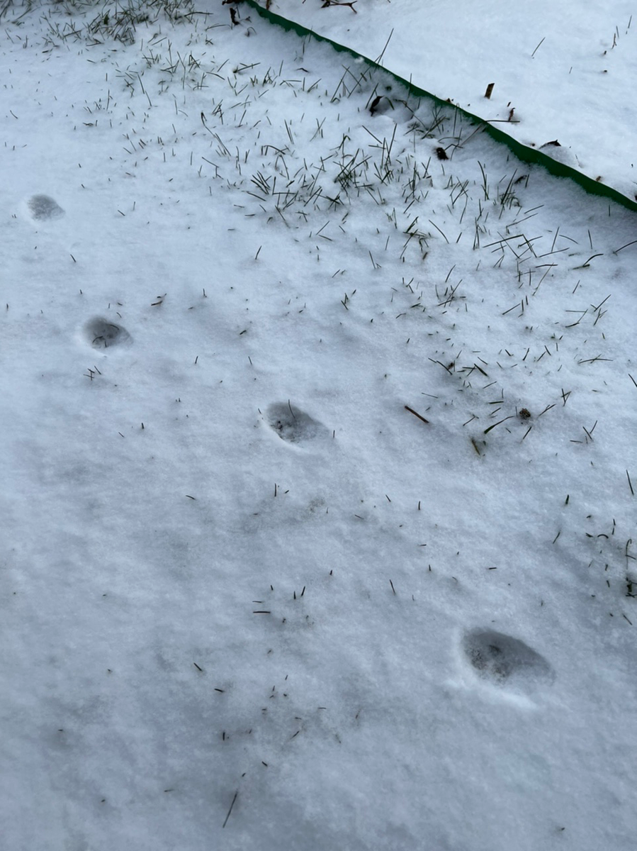 Прошлой ночью к нам пришёл Снег. Рано утром я, проснувшись, услышала скребуще-шаркающий звук, доносящийся откуда-то снизу. Подойдя к окну, удивилась, насколько светло стало на улице, хотя на тёмном небе не было ещё и намёка на рассвет. Снег, он был повсюду. Пушистый и свежий, отражающий свет фонарей и прогоняющий тьму. И дворник с лопатой, расчищающий дорогу у подъезда, издающий те самые звуки. Глядя на всю эту картину, подумала, что пора нанести последний в этом сезоне визит в сад, проверить, хорошо ли укрыты розы, и попрощаться с садом до весны. С началом дня я так и сделала. И сразу же поняла, что у нас были визитёры. Следы у крыльца садового домика, как мне показалось, принадлежали небольшой собаке: по крайне мере, мне видится отпечаток когтя в ближнем следе: А вот эти следы, уже без всякого сомнения, кошачьи: круглые, аккуратные и без малейшего намёка на выступающие когти: У декоративной капусты я задержалась на некоторое время. Сочетание ажурной фиолетовой кромки и пушистого снег