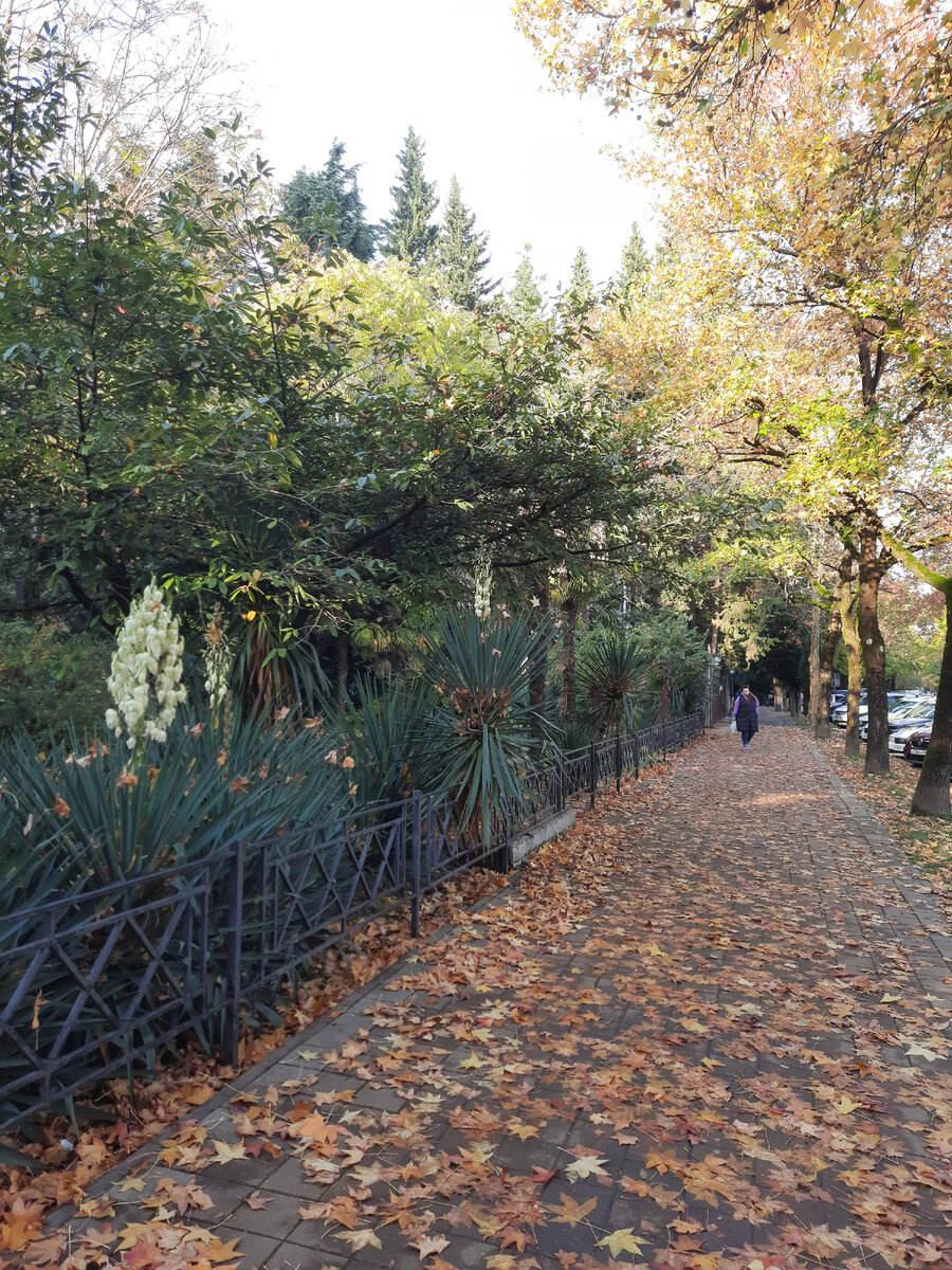 Сколько же я получила в этот день впечатлений! Утром были дождь и ветер Гром гремел. Но к 13 часам всё, кроме ветра, прошло и солнце выглянуло К морю не пошли из-за ветра. Решили погулять по набережной реки Сочи. Это получилась великолепная прогулка, полная открытий и удовольствия для меня. Я никогда не гуляла здесь осенью. Только летом! Сейчас так красиво с этим ковром из ярких листьев. Да и вообще красиво и всё радует. Потому-что река и набережная на месте. То, что за мостом на той стороне реки творится, я старалась не вспоминать. Там (ближе к устью) всё загорожено и идёт стройка по благоустройству города. Я это видела, когда ходила в парк " Ривьера". Но вернусь к рассказу о прогулке по набережной, которую пока не трогают благоустройством. Здесь уютно и спокойно. Деревья старые. Наверное они меня помнят молодой. Столько лет прошло! И я их тоже помню более молодыми. У реки всегда настроение становится лирическим. Так воздействует течение воды. Река Сочи не исключение. Мы шли
