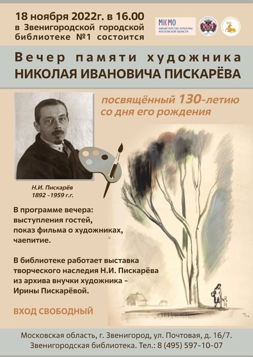 🔔Завтра, 18 ноября, в 16.00 состоится вечер памяти художника Николая Ивановича Пискарëва, посвящённый 130-летию со дня его рождения. Место проведения: Звенигородская библиотека. Вход свободный. 📌Адрес: город Звенигород, улица Почтовая, д. 16/7 📞Справки по телефону: 8(495)597-10-07