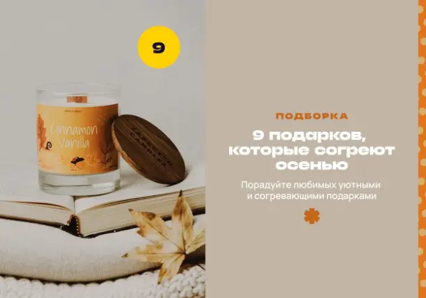 Свеча из экологичного соевого воска с ароматом корицы и ванили идеально подходит для осени. Она скрасит осенние ве