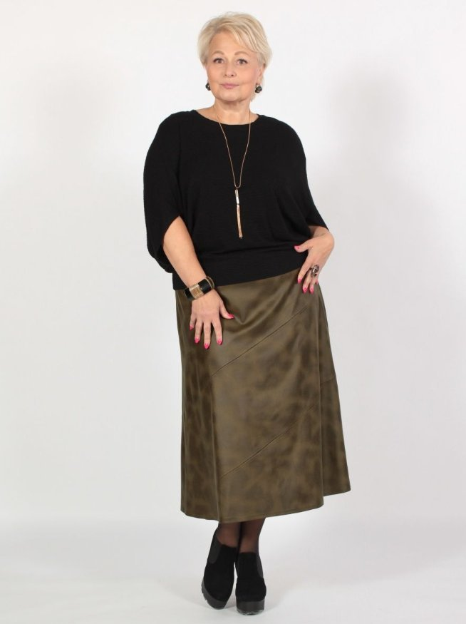 Как одеваться модно и стильно в возрасте в большом размере?! Особенно в возрасте. Найти адекватные примеры модного на такие параметры трудно. В Интернете предлагается гипюр, вышитые цветы, балахон в стиле "Дорого -бохато". Иногда попадаются яркие балахоны со странными деталями и смешными аппликациями. Это выдается за стильно и модно. Женщины в любом возрасте и комплекции заслуживают быть модными, нарядными и стильными. Для этого нужны действительно модные вещи. Миди юбка из экокожи Это вещь удобная, теплая и комфортная. Кто попробовал, оценил все преимущества. Брюки из этого материалы тоже в моде. Но лично я не считаю их стильными. Они очень сильно придают объем ногам. Миди-юбка выглядит лучше. Особенно не черная, а в других цветах: бордовый, кофейный, зеленый и серый. Огромный плюс этой юбки она держит форму и зрительно сужает. В комплект идет джемпер правильного фасона с рукавами, которые скрывают полноту и локти. Если хочется поднять градус нарядности, выбирайте такой фасон в ярких