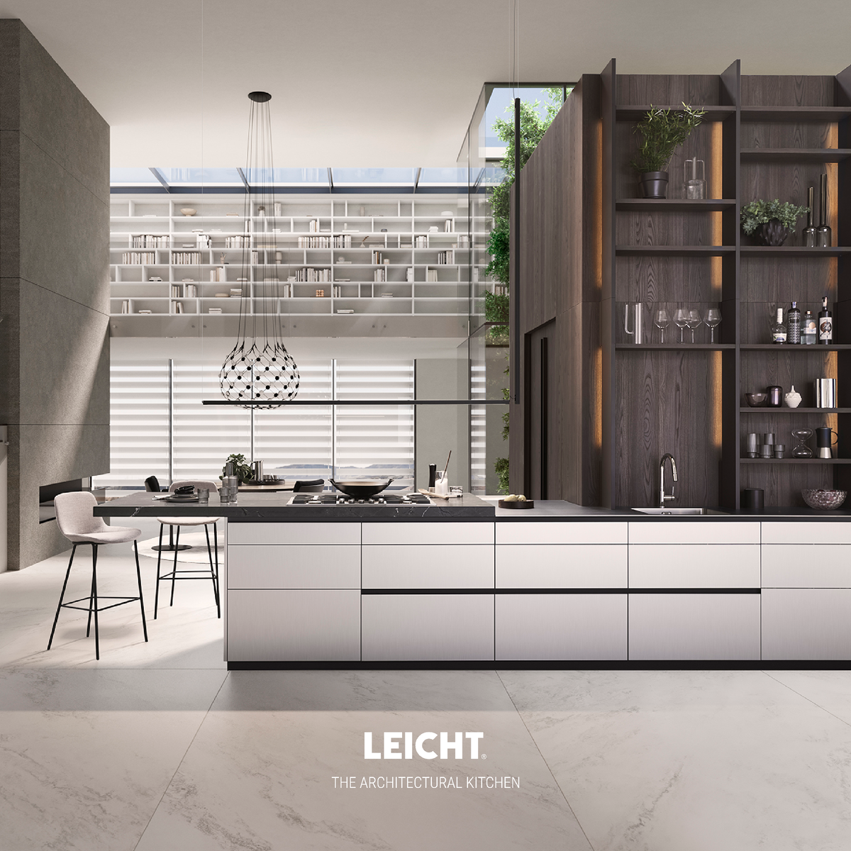 В новой коллекции LEICHT 2023 года демонстрируются интересные неординарные решения. Эта модель с фасадами Contino 12 получилась стильной и комфортной. Фасады Contino 12 – это безручечные поверхности высотой всего 12 миллиметров. Линии ультратонкого фасада становятся чёткими, изящными и чистыми. Архитектура острова неправильной геометрии. Остров включает себя традиционный корпус с зонами хранения, а также наложенную столешницу с эффектом парения, часть острова плотно примыкает к стене. Такая необычная архитектура позволяет зонировать поверхность острова на обеденную зону, зоны очага, мойки и подготовки продуктов. Ящики острова имеют разную ширину: в узком ящике удобно хранить столовые приборы, а в широком – более громоздкую утварь. Дизайн кухни освежает новая система полок ICONIC. Это открытые полки, у которых боковые вертикальные фронты отступают от стены на 5 см. Внутреннюю стенку освещает вставленная сзади светодиодная полоса. Благодаря такой конструкции система полок создаёт невер