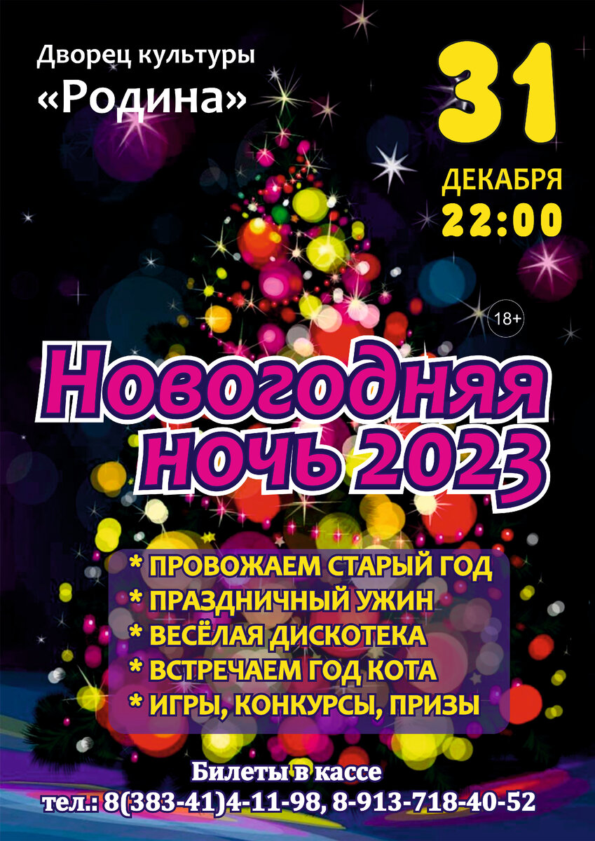 Новогодняя ночь 2023. 31 декабря 2022 г. в 22:00. Друзья, приглашаем вас встретить Новый 2023 год во Дворце культуры «Родина». Вкусный праздничный ужин под хиты разных лет с песнями, танцами, играми и незабываемыми новогодними впечатлениями от встречи с Дедом Морозом! Давайте вместе забудем о проблемах и подарим себе праздник! Билеты на новогоднюю ночь можно приобрести в кассе Дворца культуры «Родина». Телефоны для справок 8(383-41) 4-11-98, 89137184052. МАУ «Дворец культуры «Родина» г. Бердск, ул. Микрорайон, 48Б Сайт: https://rodinaberdsk.ru ВК: https://vk.com/dkrodina.berdsk 18+ Реклама Источник: сайт Бердск-Онлайн