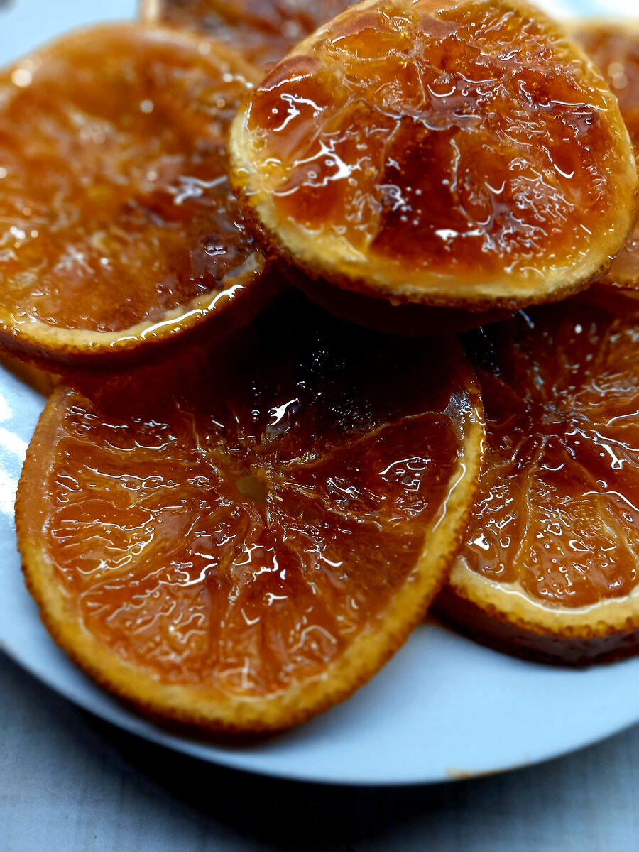 Удивительная сладость, которая точно понравится как детям, так и взрослым! Этот ароматнейший апельсин можно есть как конфеты, украшать десерты, а можно добавить прямо в чай, и вы получите необыкновенный вкус и аромат. А готовятся такие дольки максимально просто) Нам необходимы: апельсин, сахар и противень. Пергаментная бумага нам не пригодится, потому что карамель будет затекать под нее, а нам нужно,чтобы апельсин впитал в себя всю карамель. Не бойтесь,что ваша карамель прилипнет к противеню, он моется очень легко! Моем апельсин и разрезаем его на кружочки. Выкладываем на противень и выкладываем на каждый кружочек по столовой ложке сахара. Ставим противень в духовку на 180 градусов. И внимательно следим! Сахар должен растаять, апельсин выделить сок, и это все будет бурлеть. Сироп должен стать гуще, и мы переворачиваем наши апельсинчики другой стороной. Тогда же уменьшаем температуру до 120 градусов. (Лучше держать духовку открытой, чтобы не ждать пока она остынет со 180 до 120 градусо