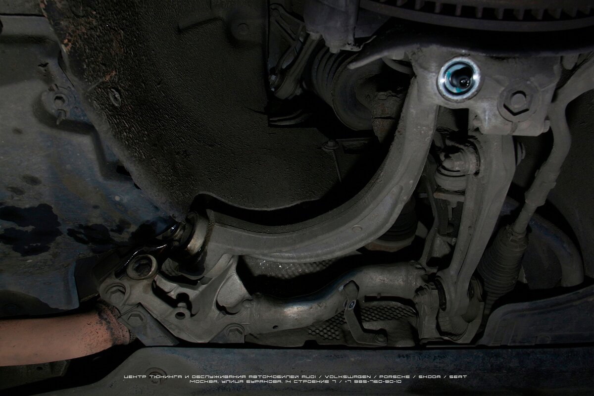 Владелец AUDI Q5 8R с двигателем 2.0 TFSI обратился в наш технический центр по причине появления скрипов подвески во время движения и при проезде неровных участков дороги. Диагностика ходовой части показала необходимость замены сайлентблока нижнего подруливающего рычага из-за разрушения уплотнительного соединения