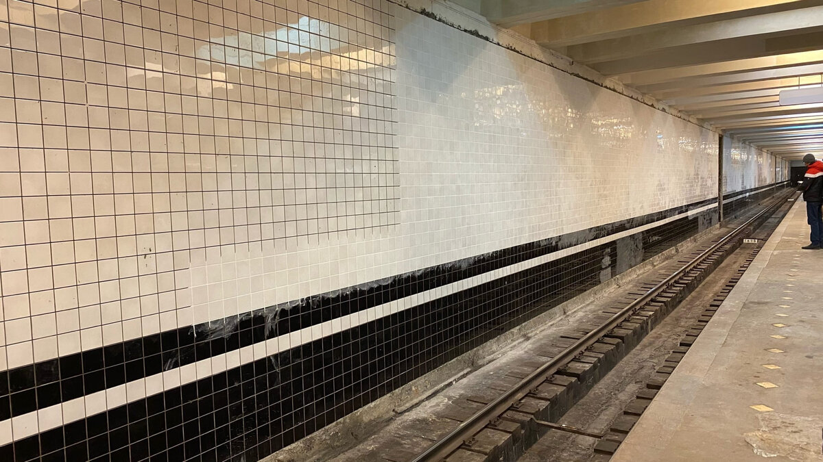 Продолжаем наблюдать за ходом облицовки путевых стен станции новой керамической плиткой. Ведётся затирка швов между плитками. Между белыми плитками используется белоснежная, между чёрными - темная.