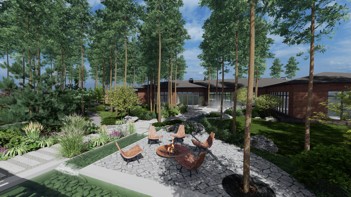 Это проект обустройства участка на территории 40 соток в Тамбове. На участке располагается большой дом, выполненный в стиле восточного минимализма, который прекрасно сочетается с ландшафтом. Особенность территории: здесь находится большое количество существующих сосен. Фишка проекта: закрытая зона зелёного кабинета, полностью закрывающаяся от посторонних глаз при помощи арки-портала с вращающейся дверью. Настоящая приватная зона. На участке также находится ручей с островом, на котором выращивается ниваки. Здесь есть даже традиционный восточный сад камней. Этот проект отличается от большинства других тем, что в нём используется огромное количество нетрадиционных для наших садов деревьев: гинкго билоба, клён маньчжурский, клён ложнозибольдова, сумах оленерогий, сосна румелийская и другие растения. Они были подобраны для этого проекта в качестве замены японских растений, которые не зимуют в нашей полосе. «Арт Стори» - профессиональное обслуживание участков, создание сада «под ключ