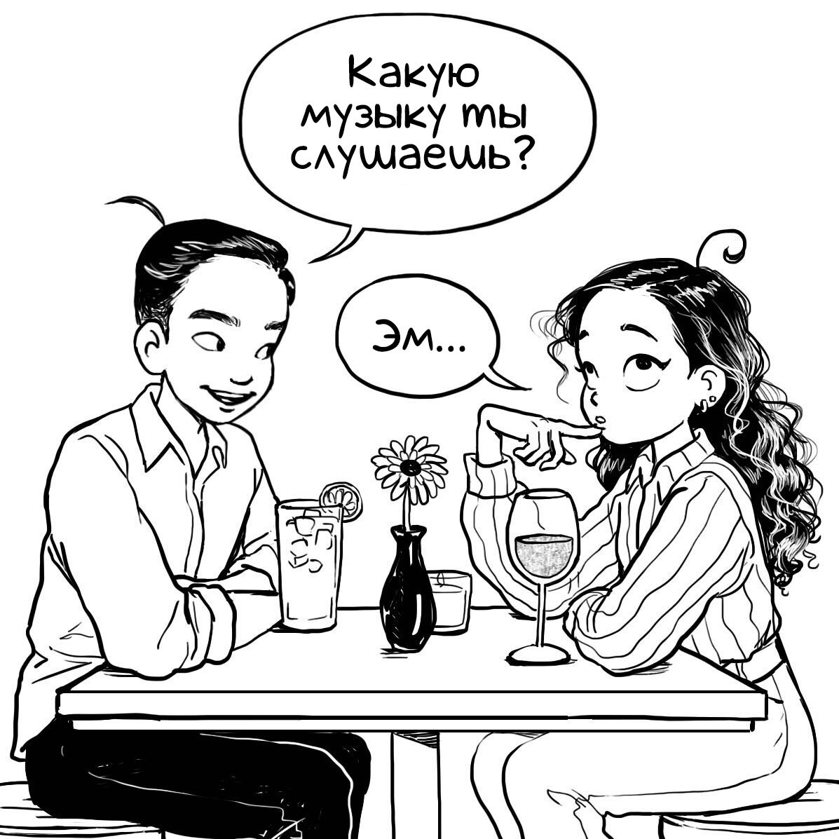В жизни Кассандры появился важный человек. Ее парень, про которого также начались истории в комиксах. Например, про их первое свидание: Музыкальные вкусы не всегда дают правильную оценку о человеке. Например я могу послушать, как мотивирующую теплую музыку, так и депрессивные треки. Мои плейлисты дня от Яндекса сильно отличаются на двух аккаунтах. Просто один у меня на компьютере, и я сижу с него, когда работаю. А второй на телефоне: дорога, уборка, тренировки. Даже, если включить волну под настроение, мне выведут абсолютно разные вещи. Немного о моем темпо-ритме на ближайшее время. Пока не закончится учеба на курсах, я почти все время провожу за работой. К тому же, стараюсь выходные проводить с друзьями, так как за год жизни в Питере мой круг общения сильно расширился, и всем следует уделить внимание. Мне это не сложно, но и отдохнуть полноценно не всегда выходит. Однако, я искренне рада проводить с ними время! Ссылка на группу ВК: ЛМК | Блог на Пульс: ЛМК