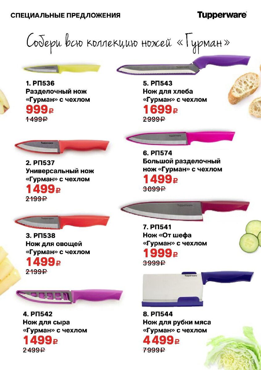 ✔ 1. Разделочный нож ≪Гурман≫ с чехлом ✔ 2. Универсальный нож «Гурман» с чехлом ✔ 3. Нож для овощей «Гурман» с чехлом ✔ 4. Нож для сыра «Гурман» с чехлом ✔ 5. Нож для хлеба «Гурман» с чехлом ✔ 6. Большой разделочный нож «Гурман» с чехлом ✔ 7. Нож от шефа «Гурман» с чехлом ✔ 8. Нож для рубки мяса «Гурман» с чехлом Преимущества и возможности использования: •Нож Гурман имеет изящный внешний вид и эргономичную ручку. •Нож выполнен из стали 18/10. •Чехол повторяет форму лезвия, тому плотно фиксируется. •Прорези на чехле обеспечивают дополнительную вентиляцию, с помощью которой остатки влаги испаряются с поверхности лезвия. •На основании чехла есть выступ, который позволяет снять чехол с лезвия одним движением большого пальца. •Ножом Гурман удобно порезать овощи и картошку, порезать сыр и колбасу. •Нож может быть использован, в том числе в походных условиях. •Безопасность при транспортировке обеспечивается за счет использования защитного чехла. •Ножи с разным цветом рукоятки могут стать хор