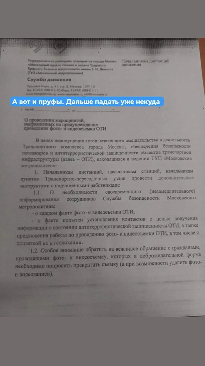 Я очень не хочу в это верить! Кажется, что здравый смысл и безопасность должны находиться рядом, идти параллельно друг другу, иногда помогать друг другу. Но некоторые нынешние новости говорят о противоположном. На одной из страниц в запрещённый сейчас социальной сети (ник пользователя inmetropoliten) в сторис была опубликована фотография внутреннего документа, в котором объясняется новая требование к проведению фото и видеосъёмки в Московском метрополитене. Запрет на фотографирование и видеосъёмку в общественном транспорте Российской Федерации - это абсолютная глупость, потому что на сегодняшний день в интернете в свободном доступе официально можно найти максимально подробную информацию обо всём, что вам интересно. Я поделился этой информацией на своей странице в telegram. Большинство людей адекватно понимают, что реального запрета не будет. Даже если всё это будет официальным документом с печатью, подписью и переделкой правил пользования московским метрополитеном, всё равно сотни и