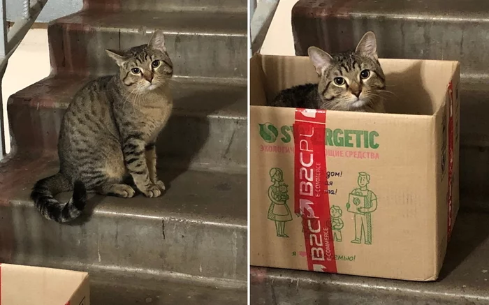 Выкинули кота и кошку. Кошка не известно где, кот в подъезде. Поставила коробку, покормила. Очень ласковый, прыгнул снизу на плечо. Помогите, пожалуйста"