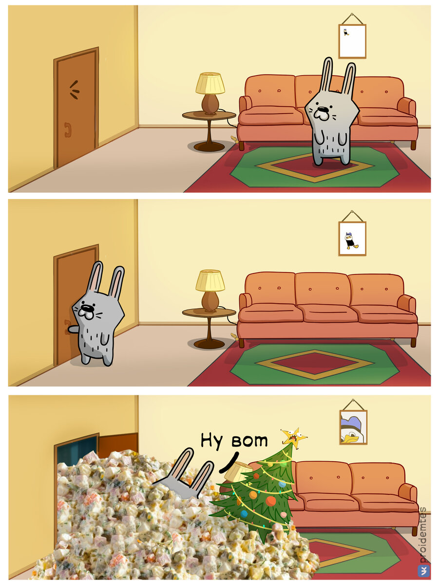 Салат Оливье уже давно успел стать традиционным новогодним блюдом в России. И пускай кому-то это «украшение стола» успело порядком поднадоесть, сложно спорить с тем, что именно Оливье вызывает очень четкую ассоциацию с празднованием Нового года. Поэтому когда речь заходит о смешных комиксах на новогоднюю тематику, можно заранее предугадать, что хотя бы какая-то часть из них будет посвящена тому самому салату. Мне, например, удалось отыскать как минимум 10 забавных комиксов про оливье. И именно их я и хочу вам сегодня показать. Чем ближе Новый год, тем сложнее скрыться от новогодней суеты, украшений и прочих праздничных атрибутов. И от Оливье в новогоднюю пору тоже спрятаться довольно сложно. Именно об этом комикс российского художника под псевдонимом proidemtes. Кот Булчик - это персонаж, созданный командой онлайн-магазина сувенирной продукции «Фабрика Желаний». Комиксы о Булчике представляют из себя забавные зарисовки на жизненные и актуальные темы. Про Оливье тоже кое-что есть. Автор