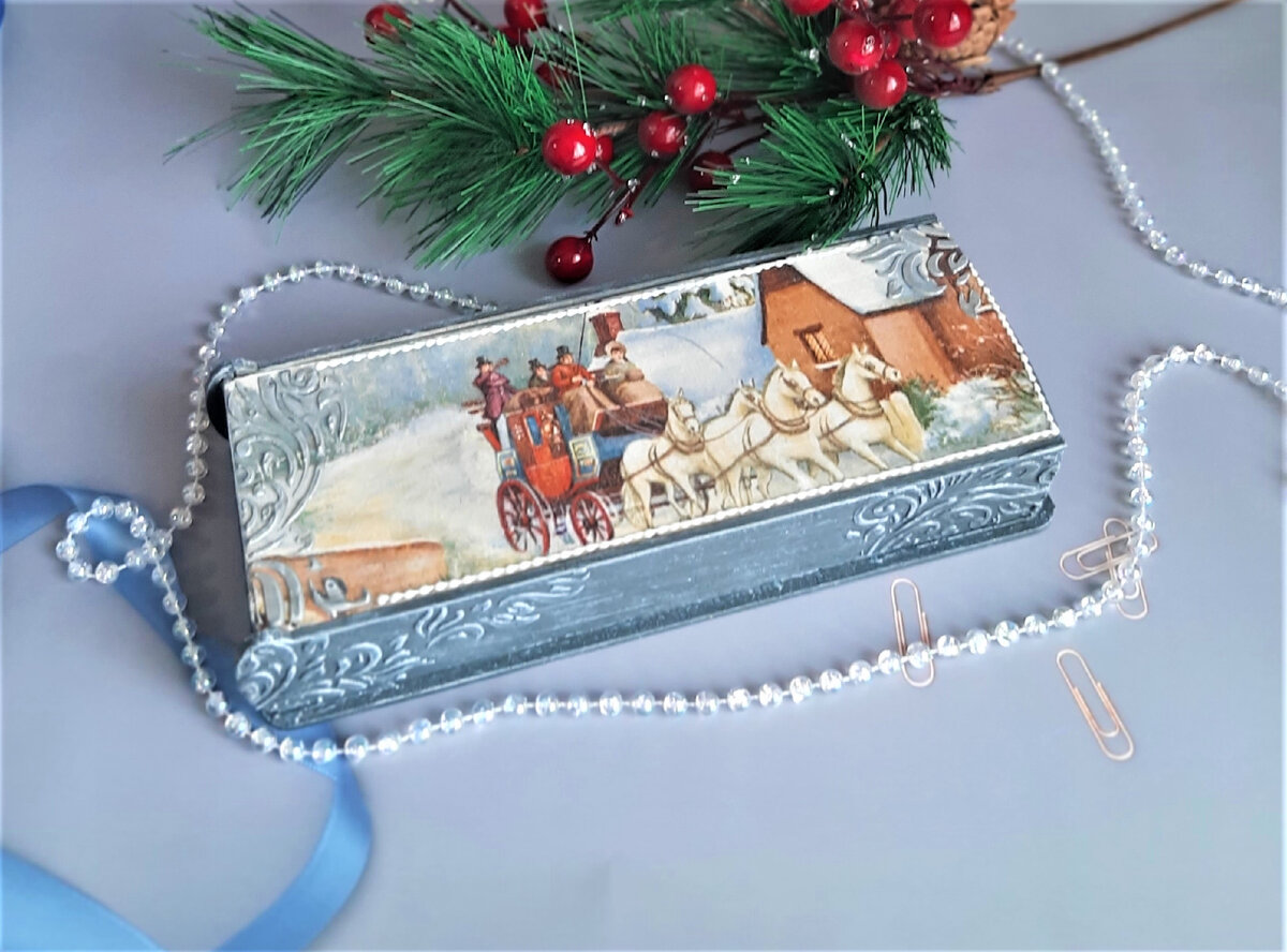 Доброго дня! Если Вы получите в подарок маленькие сувениры или денежку, их можно будет хранить вот в такой небольшой шкатулке. Скорее, это всё-таки шкатулка, но за счет продолговатой формы я причислила её к купюрницам))). В исполнении несложная, может стать и вместилищем для ваших презентов и бюджетным подарком от вас друзьям и близким. Приступим))). Понадобилось: деревянная заготовка 20х7х4 см, акриловые краски — серая и белая, акриловый лак, декупажная салфетка, белый акриловый конутр, трафарет, шпатлевка, клей ПВА, черная бархатная бумага, кисти, наждачная бумага. Заготовку шлифуем: Главная проблема работы со сборными заготовками — неровности стыков и пазов. Приходится выравнивать поверхность шпатлевкой перед основными работами: После просушки крышку шлифуем до гладкости, а боковины оставляем шероховатыми. На крышку ПВА клеим мотив из салфетки, сушим и покрываем защитным слоем лака: Боковины украшаем узором с помощью шпатлевки и трафарета: Такие же узоры, но уже окрашенной шпатлевко