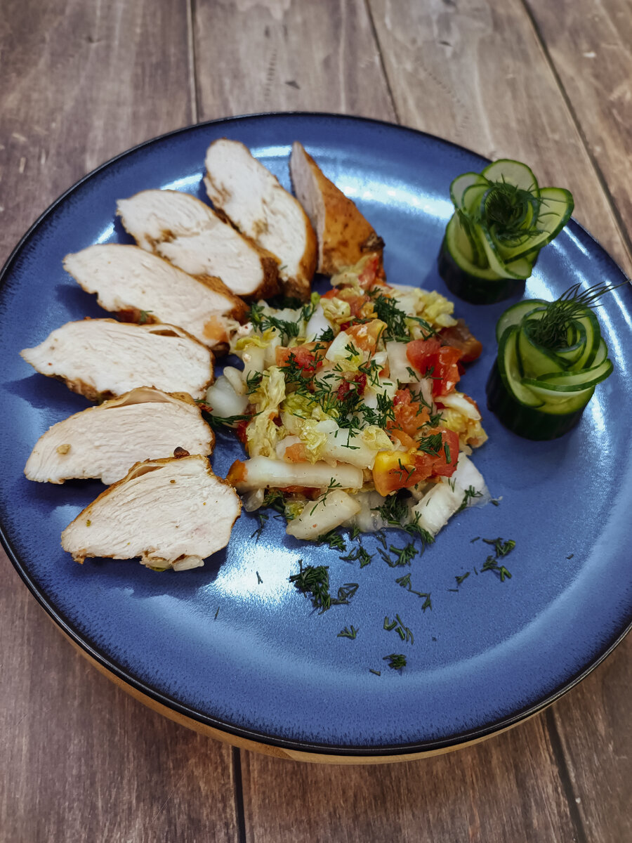 Ингредиенты: Кур.грудка - 450 гр Пекинская капуста - 300 гр Помидоры - 250 гр Зуб.чеснока - 2 шт Соль, перец, приправы по вкусу Способ приготовления: Нарезать пекинскую капусту, посолить, немного примять. К ней добавить нарезанные кубиками помидоры, чёрный молотый перец, всё хорошо перемешать и убрать в сторону. В куриную грудку добавить специи ( хмели-сунели, копчёная паприка, соль, черный молотый перец, чеснок) и хорошо её промазать. В форму для запекания выкладываем овощи и сверху куриную грудку. И ставим выпекать в разогретую духовку до 200 градусов на 40 минут. После приготовления филе грудки нарезаем кусочками, выкладываем на тарелку, добавляем к ней наши запечённые овощи и наше блюдо готово. Всем приятного аппетита 😊