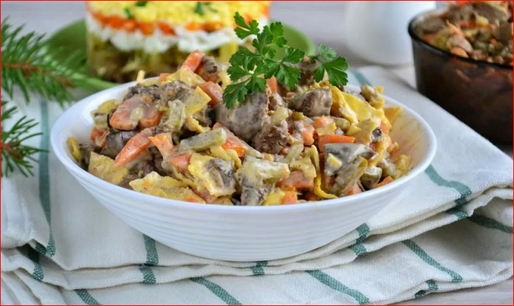Этот салат очень хорош, чтобы сытно и вкусно поесть, для угощения гостей. Особенность этого салата, что вкуснее он не охлаждённый, а именно тёплый. Именно так он в прямом смысле слова, нежный и вкусней всего.