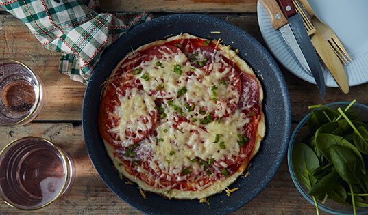 Пицца на сковороде - это простое сметанное тесто, самые обычные топинги, минимум времени и затрат. Отличный рецепт в копилку тех, кто вечно торопится, кому нужен интересный завтрак, и тех, кто пока еще не обзавелся духовкой. Вам понадобится: Мука пшеничная 0.5 стакана