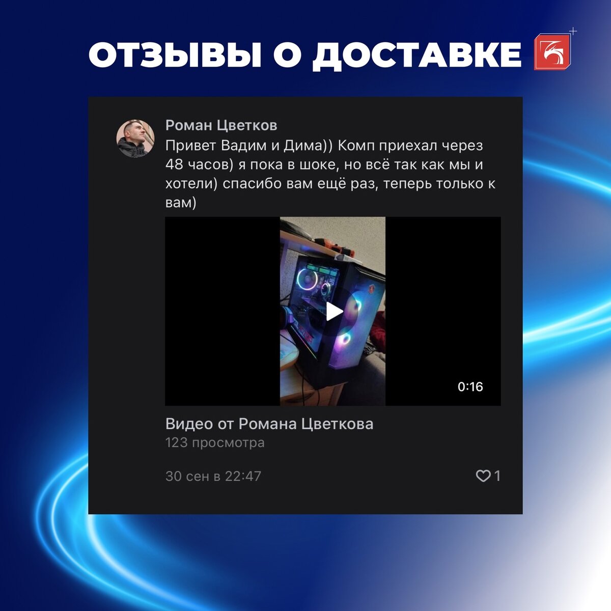 — «Хочется отдельно отметить, что уделяют пристальное внимание безопасности при перевозке, внутри станции был специальный вспененный пакет, короб был со специальным наполнителем, что исключало любые повреждения… Идеальная сборка с возможностью потом самостоятельно нарастить мощности» — «Комп приехал через 48 часов, я пока сам в шоке, но всё так, как мы хотели» — «Заказал комп 8 числа, а уже 10 числа вечером он был у меня» — «Собрали на следующий день после оплаты мне его везли гораздо дольше чем он собирался. Оплатил 6 числа, собрали 7, отправили 8, прислали 14 числа» Это примеры отзывов клиентов касательно сроков доставки. А мы напоминаем, что впереди новогодние праздники, поэтому сроки доставки и сборки могут затянуться. Подумайте о подарках заранее, чтобы успеть порадовать себя и своих близких вовремя :)