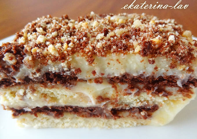 Этот рецепт на тот случай, когда хочется сладкого, но не хочется возиться с тестом и духовкой. Торт из печенья с заварным кремом получается очень мягким и нежным, просто тает во рту! ИНГРЕДИЕНТЫ: 500 гр печенья ("Юбилейное" и т.п.) 1 л молока 250 гр сахара 150 гр сливочного масла 4 яйца 4 ст.л муки 1 ст.л ванильного сахара ПРИГОТОВЛЕНИЕ: 1. Приготовим заварной крем. В ковшик (кастрюлю) наливаем молоко, ставим на плиту и нагреваем на медленном огне. Тем временем взбиваем яйца с сахаром 1,5-2 минуты. Далее всыпаем муку и немного вбиваем до однородности. 2. Из кастрюли отливаем примерно половину горячего молока и понемногу вливаем к яйцам, параллельно взбивая. Оставшуюся половину молока продолжаем нагревать почти до кипения. Взбитую яично-молочную смесь тонкой струйкой вливаем в кастрюлю с молоком (помешивая), доводим до кипения и варим крем на небольшом огне 1,5-2 минуты (постоянно помешивая), после чего снимаем с плиты. 3. В горячий крем добавляем ванильный сахар, сливочное масло и пере