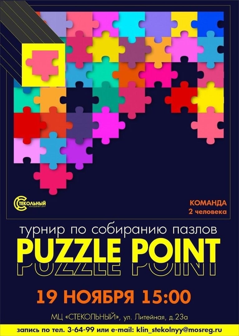 В МЦ «Стекольный» в Клину дважды в месяц будут проводить турнир по скоростному сбору пазлов «PUZZLE POINT». Первый такой турнир состоится уже завтра, 19 ноября. Участвовать в турнире могут команды из двух человек. Каждому для сборки предоставляется картинка из 500 деталей, и будет отведено время. Кто первый собрал – тот и победил. На первый турнир принимаются заявки по телефону (3-64-99), электронной почте (klin_stekolnyy@mosreg.ru) и в комментариях к посту. 19 ноября в 15:00 участников ждут в «Стекольном».