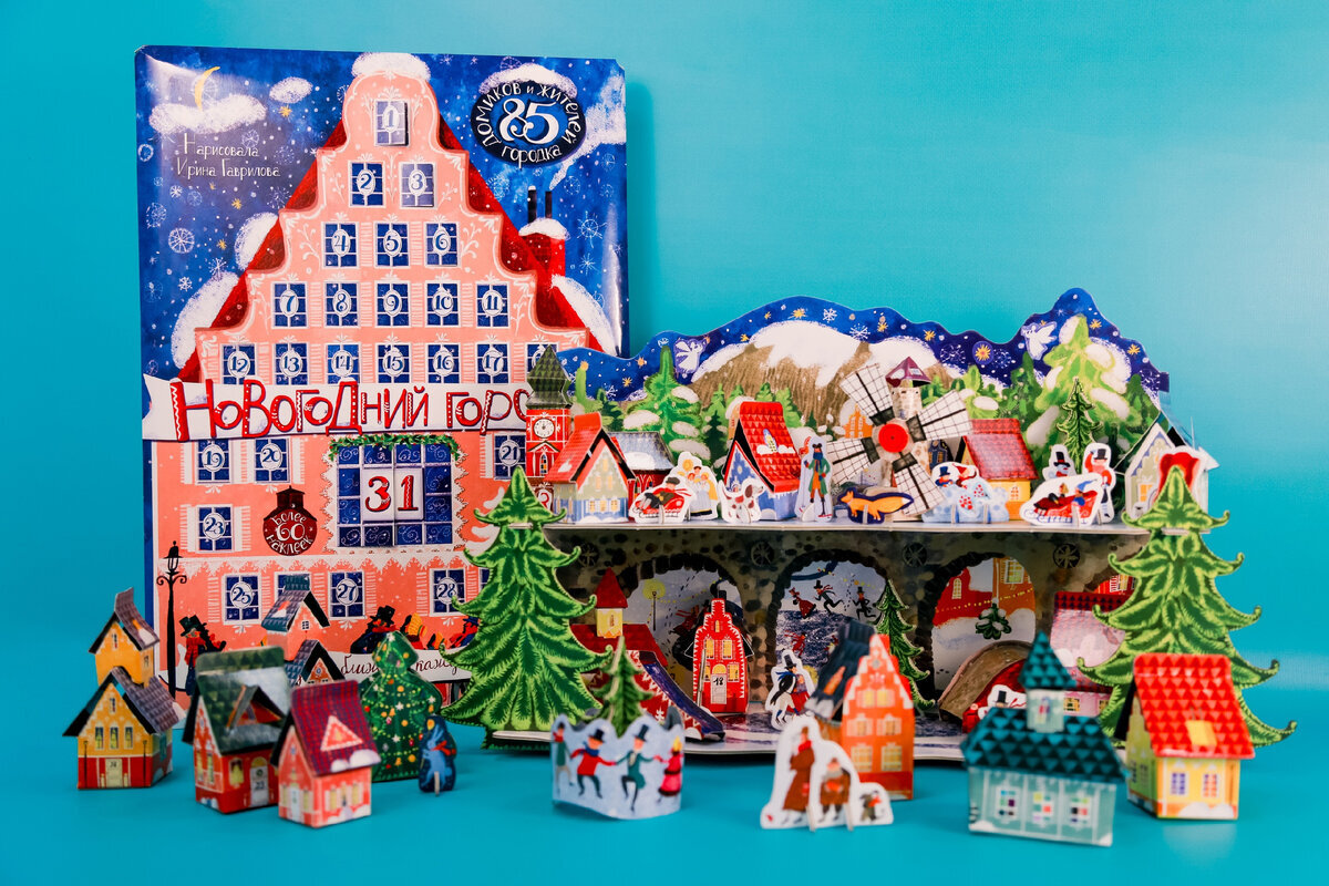 «Новогодний городок» – это объёмный сборный город: 15 разноцветных домиков, мельница, мостик, ледяная горка и 24 фигурки жителей, которые катаются на санках, коньках и лыжах, водят хоровод вокруг ёлки, играют в снежки и поют песни. Можно поместить городок на полке или подоконнике, украсить гирляндой из светодиодных свечек, придумывать и разыгрывать истории с его обитателями! А еще в конверте есть большой лист новогодних наклеек, которыми можно украшать сам городок или новогодние подарки и открытки!