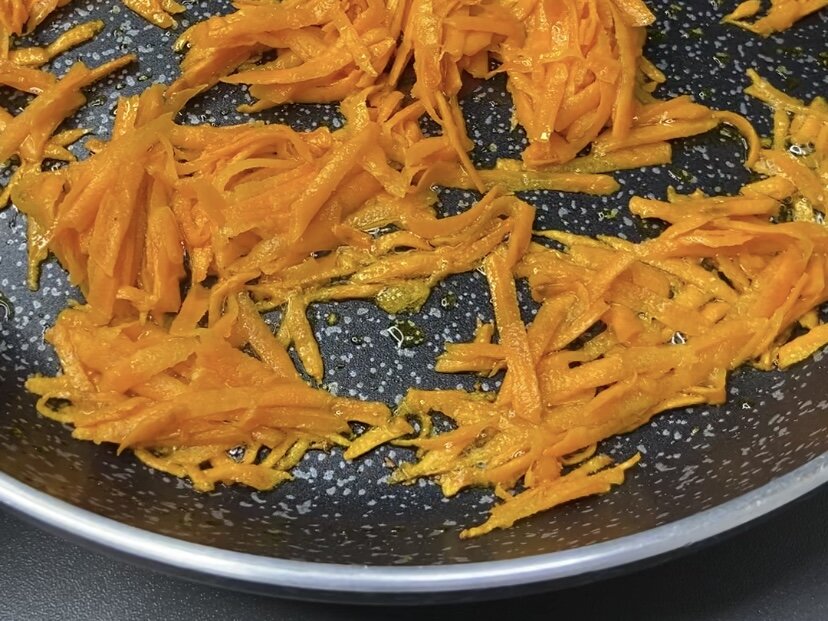 Недавно мне «прилетело» в комментариях: «Все салаты с мясом, можно уже что-нибудь новенькое и без мяса?» Конечно же можно, с удовольствием поделюсь с вами своей находкой. Салат потрясающий, свежесть салату придают свежие огурцы и маринованный лук. Сочетание продуктов оказалось идеальным, как говорится, ни убавить, ни прибавить! Я приготовила огромную порцию, мы ели салат два дня. И хочу заметить, на второй день салат стал еще вкуснее. Начнем приготовление с моркови. Натираем на крупной тёрке и обжариваем до мягкости на небольшом количестве растительного масла, немного посолить по вкусу. А пока морковь обжаривается, замаринуем лук. Нарезаем полукольцами, можно четверть кольцами, вливаем яблочный уксус, добавляем соль, сахар, заливаем холодной водой. Минут 15 постоять. Затем необходимо заранее отварить рис, в подсоленной воде. Выкладываем его первым слоем, делаем частую сеточку из майонеза. Консервы , в лучшем случае лосось, но можно взять и более бюджетный вариант консервированной