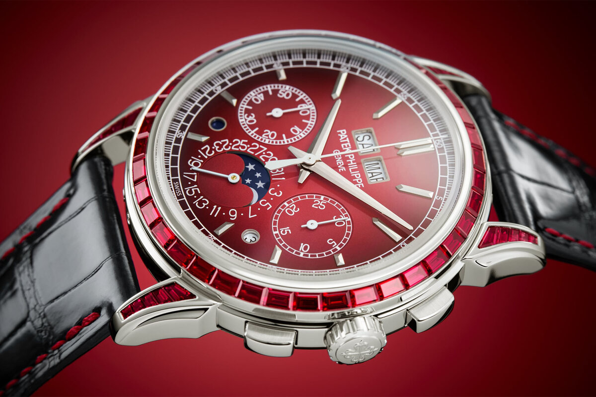 Две новинки Patek Philippe получили цветные лакированные циферблаты и ювелирный акцент в виде цветных драгоценных камней. Часы представлены в платиновом корпусе 41 х 12,7 мм. Безель и ушки корпуса инкрустированы 58 рубинами или синими сапфирами багетной огранки.