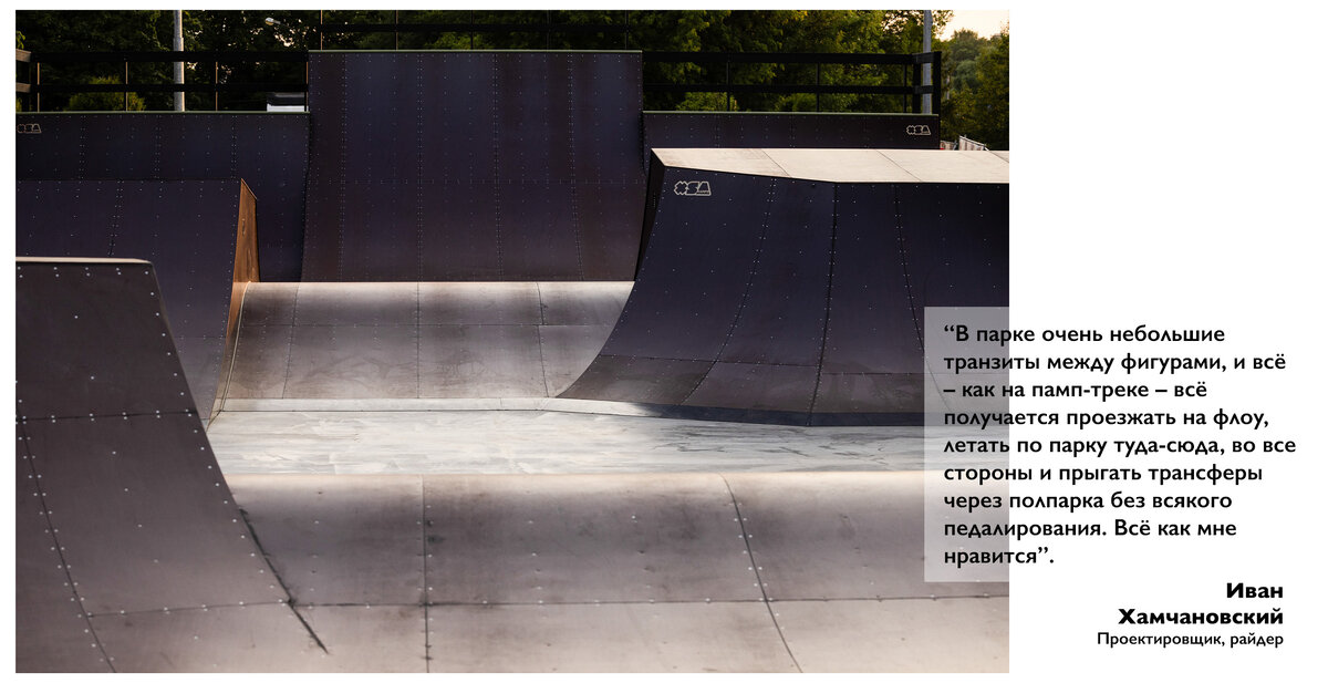 Наш парк в районе Новой Москвы — Солнцево — это 1000 квадратных метров идеальных фанерных форм, и нелинейных траекторий. Если говорить про райдеров - этот парк понравится всем, кто смотрит в сторону спортивного развития и подготовки к соревнованиям, но не согласен на прямые парки-тренажеры. Большая концентрация линий и связанных пересечений присутствует в парке на повышенном уровне. Размеры фигур очень близки к высшим соревновательным, но при этом еще прощают ошибки. Сам парк состоит из трёх зон: Такая конфигурация позволяет использовать тот же объем пространства для получения большего количество линий, многократно увеличивая наполненность парка траекториями. Разработкой парка занималось КБ XSA по проекту Ивана "Бороды" Хамчановского – известного дизайнера множества парков для крупнейших соревнований и стационарных спотов. Внутри компании мы уверены – это лучший бесплатный открытый парк Москвы для практики эйр-катания. Если говорить про жителей района, то они получили визуально прекрас