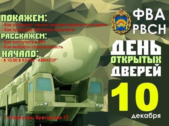 Школьники смогут ознакомиться с особенностями одной из самых востребованных военных профессий В Серпуховском филиале Военной академии РВСН им. Петра Великого 10 декабря пройдёт День открытых дверей. На мероприятие приглашаются учащиеся 10-11 классов, студенты образовательных техникумов, лицеев, профучилищ и их родители. Ребятам покажут материально-техническую базу института, расскажут об истории учебного заведения, о быте курсантов, о порядке поступления. В филиале есть всё для продуктивной учёбы и комфортного отдыха: современные аудитории с практическим оборудованием, клуб, библиотека, музей, спортивные комплексы, бассейн, автодром, стрелковый тир и площадки для тактических занятий. Сотрудники института ответят на все вопросы, интересующие будущих абитуриентов и их родителей. Начало мероприятия в 10:00. Адрес: г. Серпухов, улица Бригадная- 17. Автор: Татьяна Невская