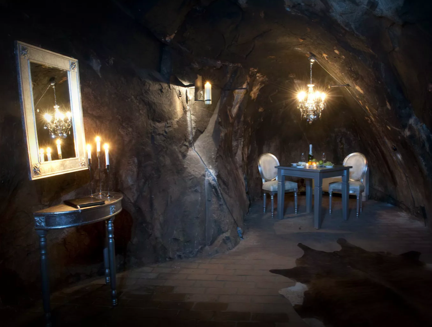 - Вот мы и пришли, - Вера остановилась посередине грота, стены пол и потолок которого были обработаны и выровнены. И этот грот был обставлен мебелью! В глубокой нише стояла широкая кровать. Рядом с кроватью на стене висело большое зеркало, к ней был приставлен женский столик с пуфиком. Имелся и круглый стол со стульями на гнутых ножках, буфет. А у длинной стены из отесанного камня был сложен камин, труба уходила вверх и терялась в темноте потолка. У камина лежали дрова. На столе , каминной полке были расставлены канделябры со свечами. Оставалось только зажечь их. Два висели с обоих сторон от зеркала.