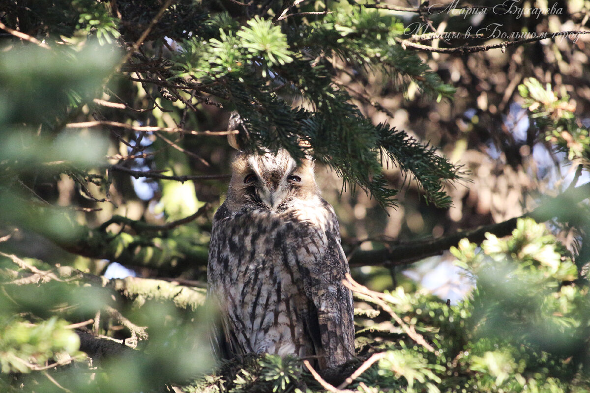 В первую очередь навестила ушастых сов. В этот раз смогла насчитать 4 штуки. Эту сову мне показала местная жительница. Она пошутила, что это, мол, мальчик, потому что очень низко сидит и не боится :) А так половой диморфизм у ушастых сов не выражен, и остаётся только догадываться, кто же это такой бесстрашный.
