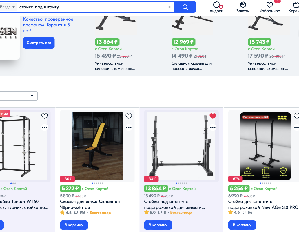 Вот такую картинку мы наблюдаем при запросе "стойка под штангу" на озоне, на первой странице.