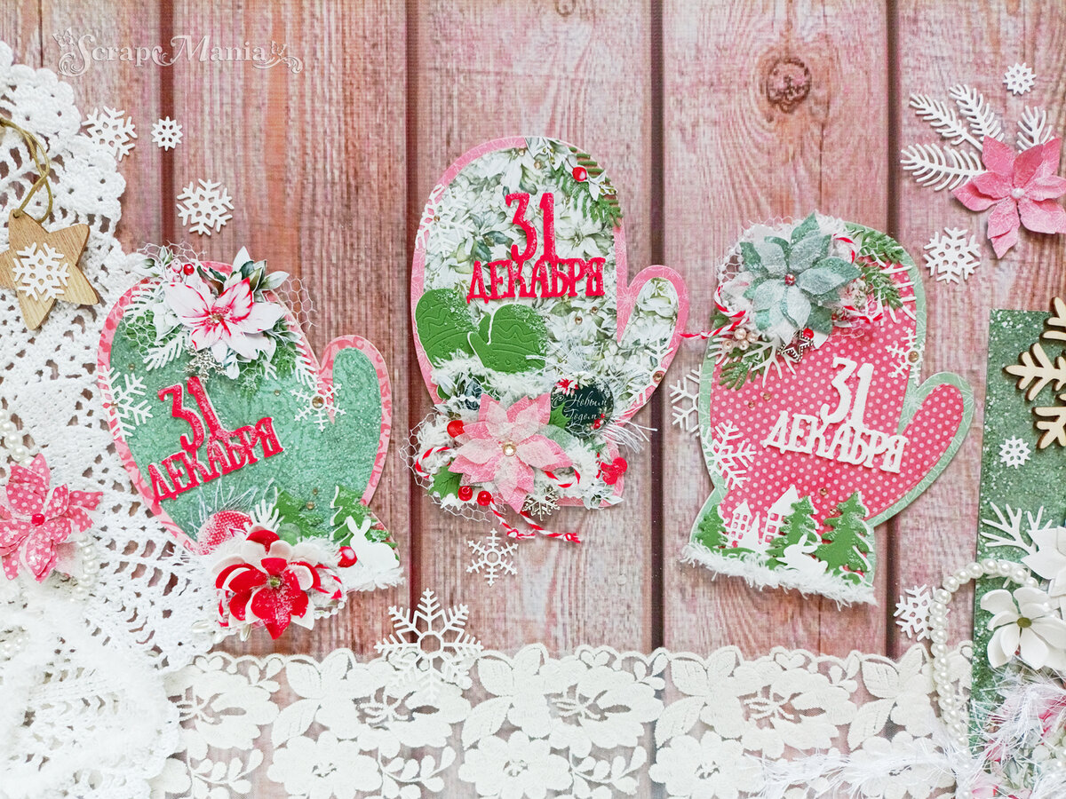 Для этого этапа я приготовила три открыточки в форме варежек (размером 10,5 на 14 см), а оформила их с помощью коллекции "Зимняя прелесть". Название второго этапа - "Зимний цветок" (пуансеттия), который и является одним из обязательных элементов. Мои цветы сделаны с помощью нашего ножика "Пуансеттия малая" (из фоамирана, скрапбумаги и флористического фетра), а как именно - я показываю в мастер-классе к этому этапу. Второй обязательный элемент (фишки) - они расположены как раз возле пуансеттий на каждой варежке.