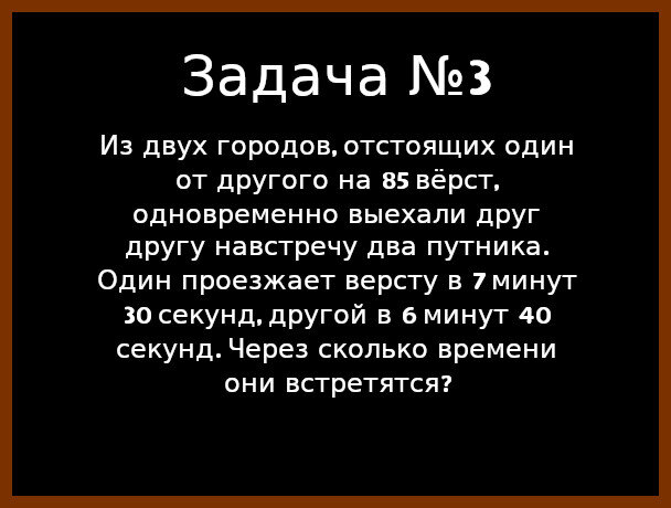 Моё решение ниже. Решение Первым делом нужно выразить скорость путников в одинаковых единицах времени. Скорость первого путника — 1 верста в 7 минут 30 секунд. Если умножить на 2, получим 2 версты в 15 минут, а если умножим на 8, получим 8 вёрст в час. Скорость второго путника — 1 верста в 6 минут 40 секунд. Если умножить на 3, получим 3 версты в 20 минут, а если умножим на 9, получим 9 вёрст в час. Скорость сближения путников: 8+9= 17 вёрст в час. Чтобы узнать время, через которое путники встретятся, нужно расстояние поделить на скорость сближения. 85÷17=5 часов. Ответ: Путники встретятся через 5 часов.