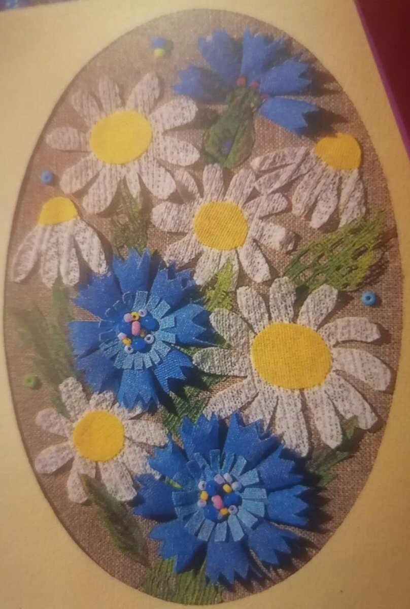 Из проклеенной ткани голубого цвета вырежьте круг. Края его вырежьте зубчиками. Собирать василёк надо непосредственно на ткани основы.