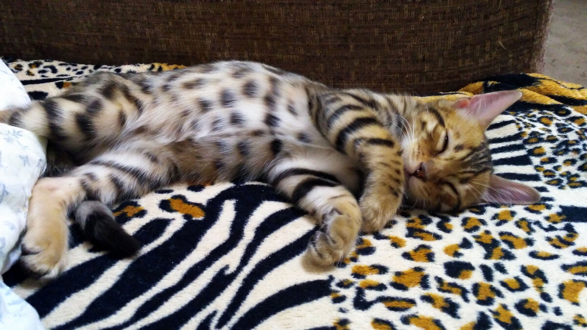 Абсолютно безбашенная порода! Носится как пуля круглые сутки с небольшими перерывами на сон и еду. Грызёт всё, что видит и может достать. А может он многое... Всё, что может унести в зубах по весу - превращает в игрушку, таскает по квартире и тоже грызёт... Ест в три раза больше обычного кота. Падает с любой высоты и получает от этого удовольствие. Любит играть с водой, грызть провода. Настойчиво требует внимания к себе, но на руках не сидит и не ласкается, как обычная кошка. Трудно поддаётся воспитанию. НО! Усвоенные навыки взаимодействия с окружающими и команды выполняет безупречно. Словом, очень сложная порода, но невероятно милая, обаятельная и социализированная. Общается со мной на уровне маленького ребёнка: "всё понимаю, но делаю так, как хочу"... Порода для тех, кто безусловно любит и ценит кошек; у кого много времени и желания бесконечно взаимодействовать с животным; признать его абсолютным членом семьи. Бенгальская порода, 2 месяца, Кристиан.