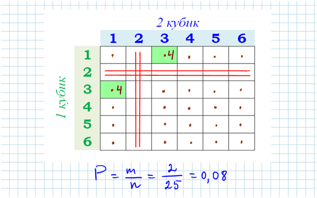 Известно, что два очка не выпали ни разу, значит надо исключить те случаи, в которых 2 очка выпало в первый раз или во второй раз – вычеркиваем вторую строку и второй столбец в таблице сумм.