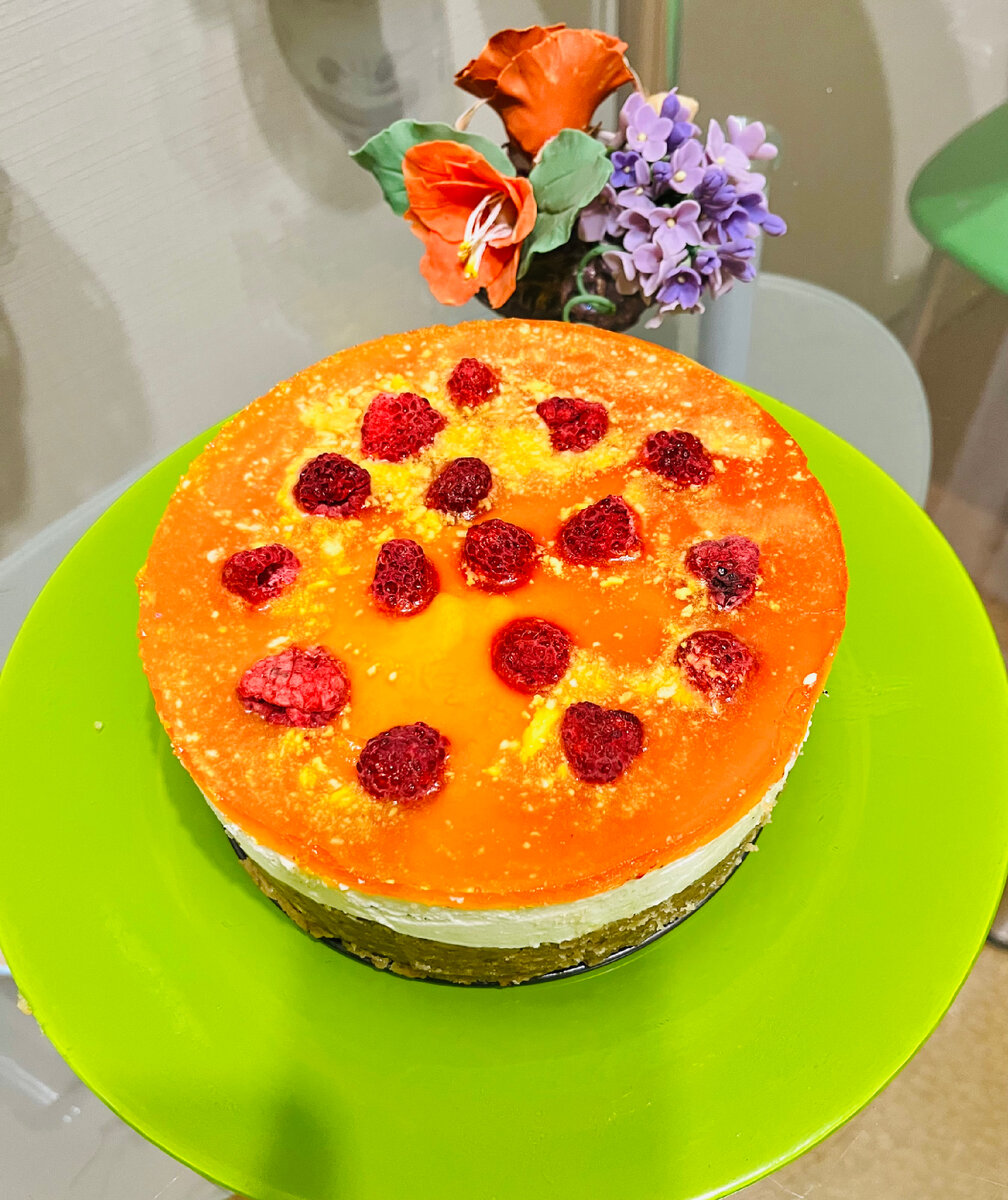 Уж как мне сладенького захотелось!! Но в нашей местности кондитеры своими изысками нас не балуют, а выпечка в магазинах оставляет желать лучшего..😞 Вот и поняла, что кроме как самой себя, меня никто не побалует. Задумано— приступаю! Для нижнего коржа взяла 100 граммовую пачку печенья, 10 штук грецких орехов, 40 гр сливочного масла и немного сахара. Орехи с печеньем взбила блендером, добавила сахар и масло растопленное. Для более клейкой текстуры коржа растопила желатин и немного добавила для загустения. И ровным слоем все сложила в разъемную форму. Для средней прослойки взяла баночку сыра маскарпоне и сливки 33% жирности. В сыр добавила немного сахара, сливки хорошо взбила, все смешала до однородности. В эту массу вылила остатки растопленного желатина, и залила в форму. Третьим слоем залила фруктовое желе, купленное в магазине, пакетированное, предварительно залила горячей водой. Здесь сразу сделала ошибку, желе не до конца остыло, как я его уже налила на сливочно- творожную осно
