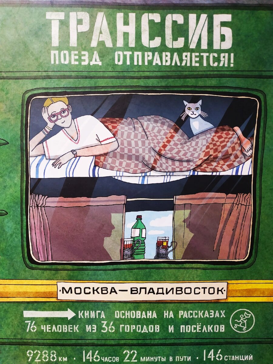 "Сколько лет работаю на рейсе Москва-Владивосток, а не перестаю удивляться. Какая же огромная у нас страна, одна шестая часть суши. Песни разные слушаем, едим разные блюда, традиции такие разные… И даже в разных богов верим. Вот только язык у нас общий. И Транссиб. Один на всех", - рассуждает на страницах этой книги проводница поезда дальнего, очень дальнего следования. Я люблю поезда и выбираю их даже в ущерб удобству и времени (на фото я так, скрючившись, из Сочи ехала, а всё равно довольная). Это настоящее маленькое приключение, а в случае с поездом на Владивосток - приключение большое. Что ж, книга издательства Самокат (совместно с РЖД) позволяет совершить его, не выходя из дома. Это невероятно красивое издание.❤️ Иллюстрации Анны Десницкой раскрывают в авторе, что называется, нашего человека, поклонницу железных дорог - уж больно на картинках точные детали: расцветки пледа у пассажиров плацкарта, сами эти пассажиры и их обязательные поездные занятия (поедание "Доширака" с дымк