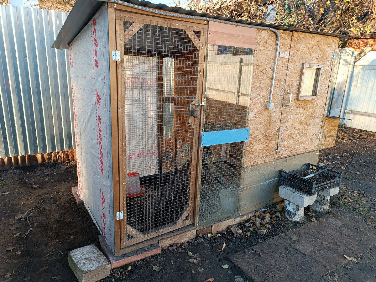 Здравствуйте друзья. С наступлением зимы необходимо подумать о курицах. По природе своей, если у кур есть небольшой закрывающийся домик, то питомцы переносят зиму. Они меньше двигаются, сидят нахохлившись распушив перья. Питание должно быть, как и питьевая вода. Но вода при минусовой температуре замерзает. Что бы курицам было комфортно и они как обычно несли яйца, курятник надо утеплить. Желательно стенки домика сделать утепленными, двойными. Подвести к курятнику электричество. Сделать свет и поставить обогреватель. Если есть окошко, то света будет достаточно. Выгул желательно закрыть, от ветра. Если не закрыть будет холоднее и грязнее внутри. Снег и дождь не желателен пернатым. От сырости птицы болеют. С фасада поставил стекло. Дверь пока не утеплена. Через неё поступает воздух. Боковинки утеплил так. Внизу под домиком, стекло. В домике есть светильник и обогреватель. В нижней части, дверка из резинового автомобильного коврика. Защищает от ветра. Курицы самостоятельно в